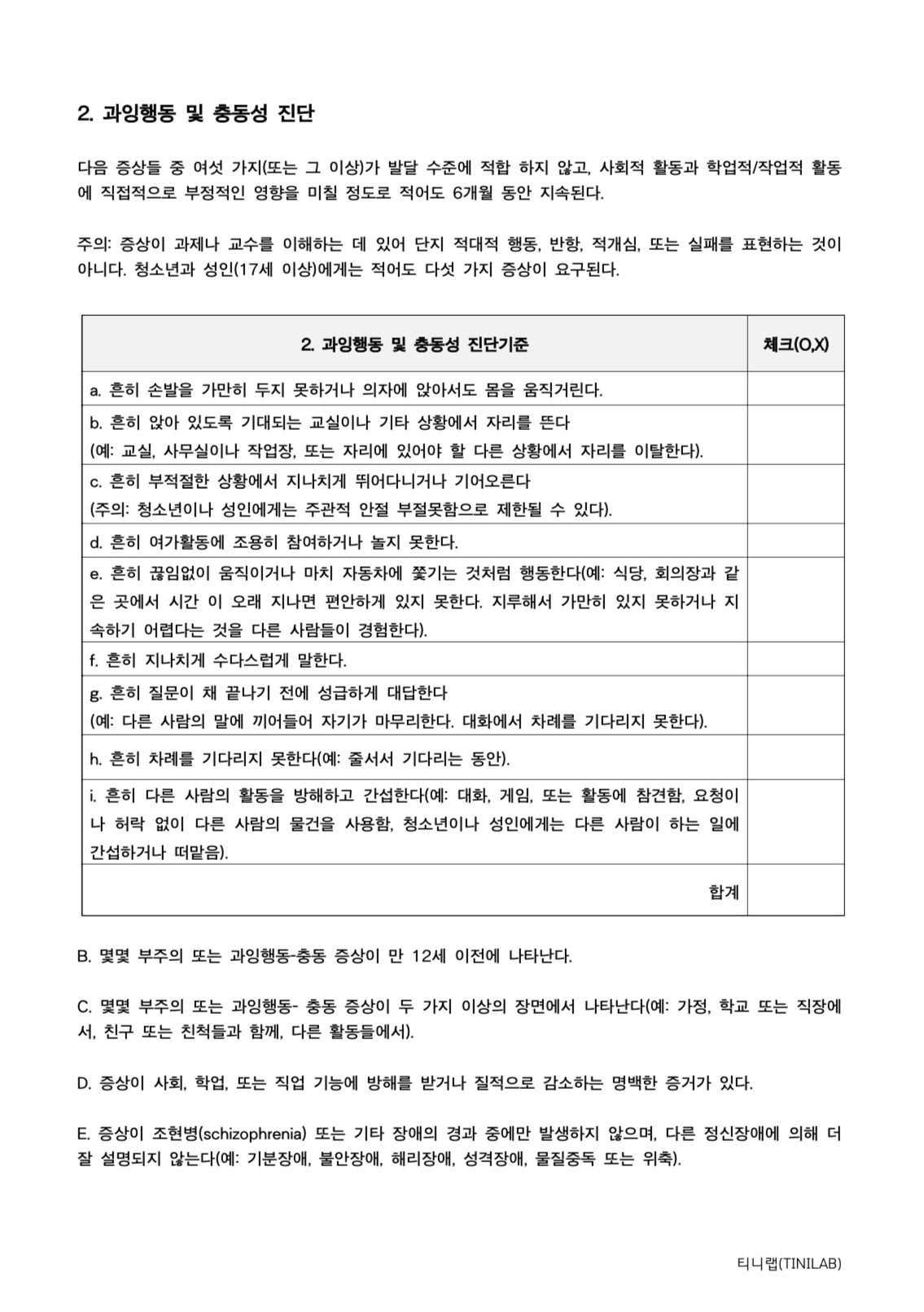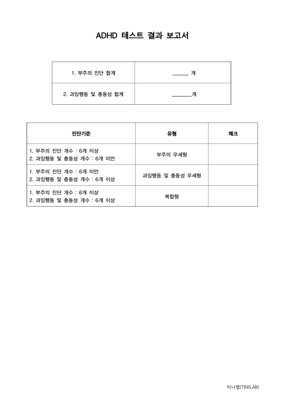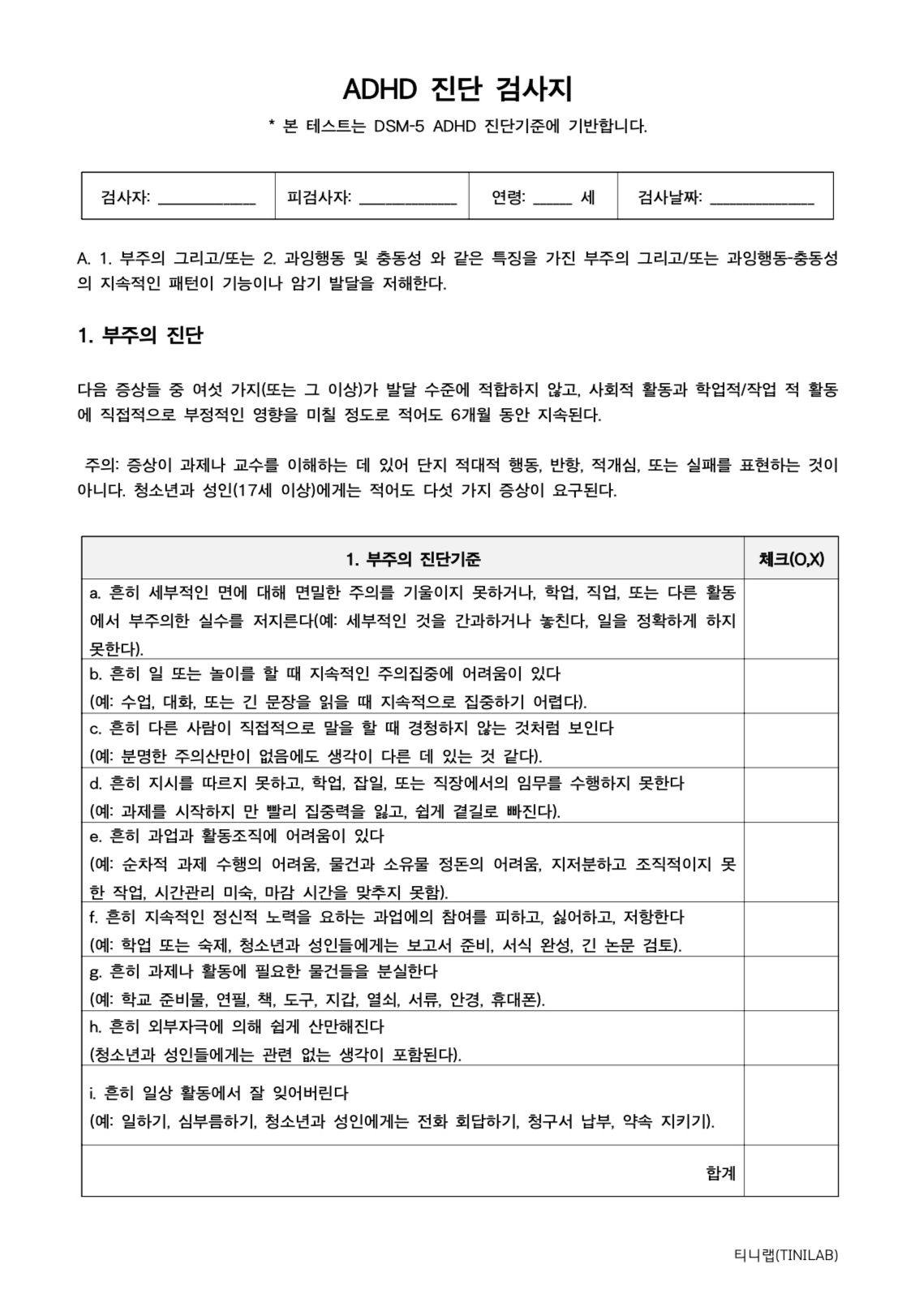 티니랩에서 직접 만든 ADHD 진단 검사지입니다.